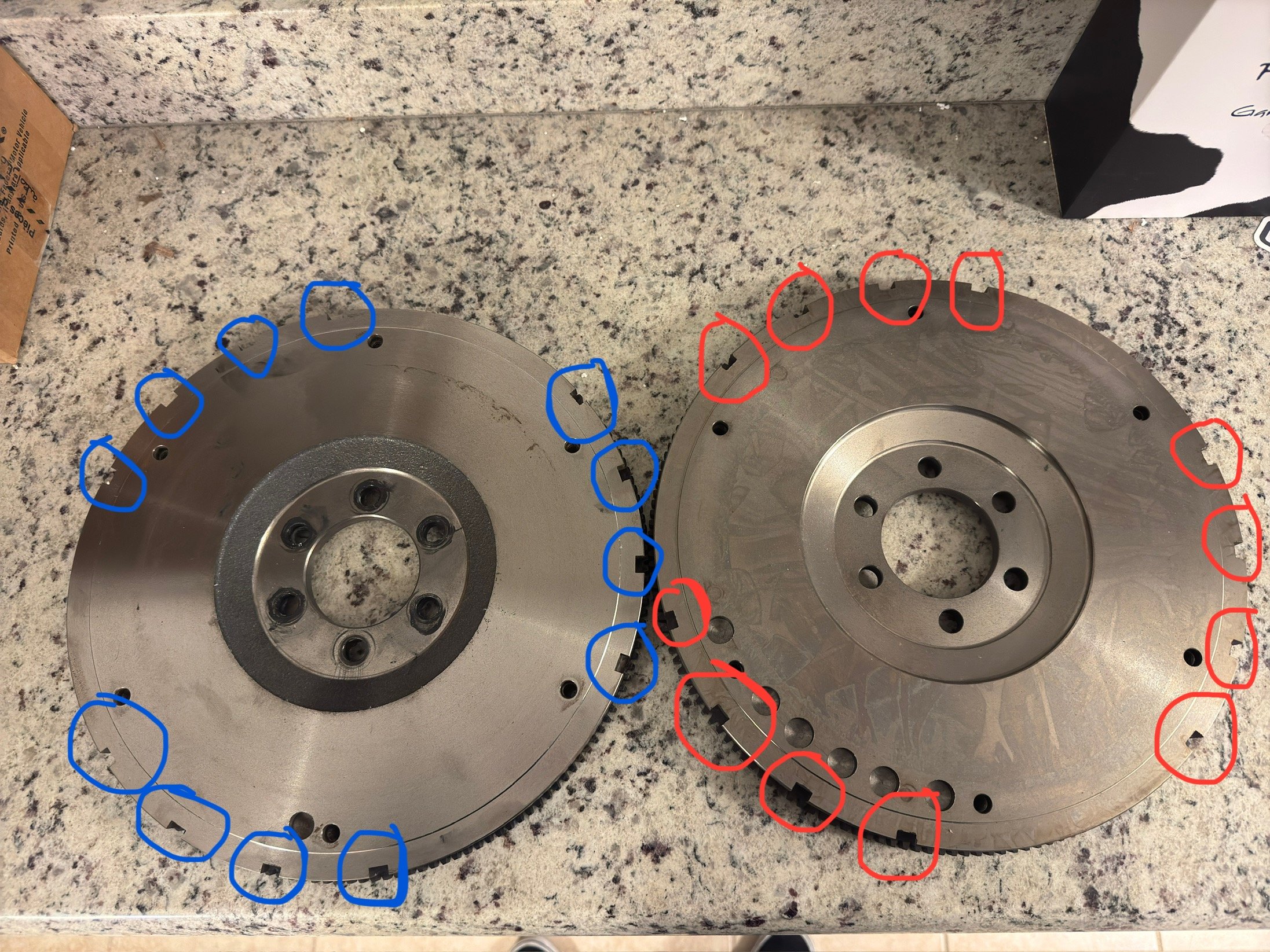 Here is a comparison photo. The bad flywheel is on the left. Notice how the blue marks are slightly more counter clockwise in location than the red marks.