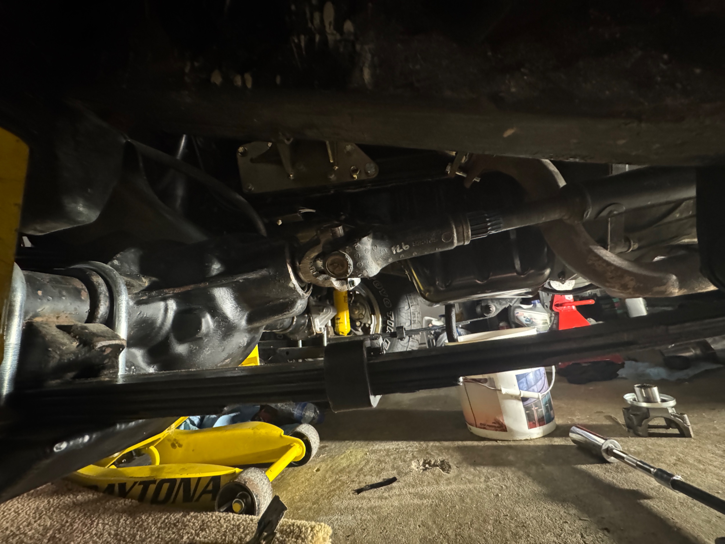I had a free TJ front driveshaft from someone I got some parts from last year, so I decided to try it out. It was in poor shape, so I’m not actually going to use it, but it gave me an idea of fitment and angles. I think things look pretty good.