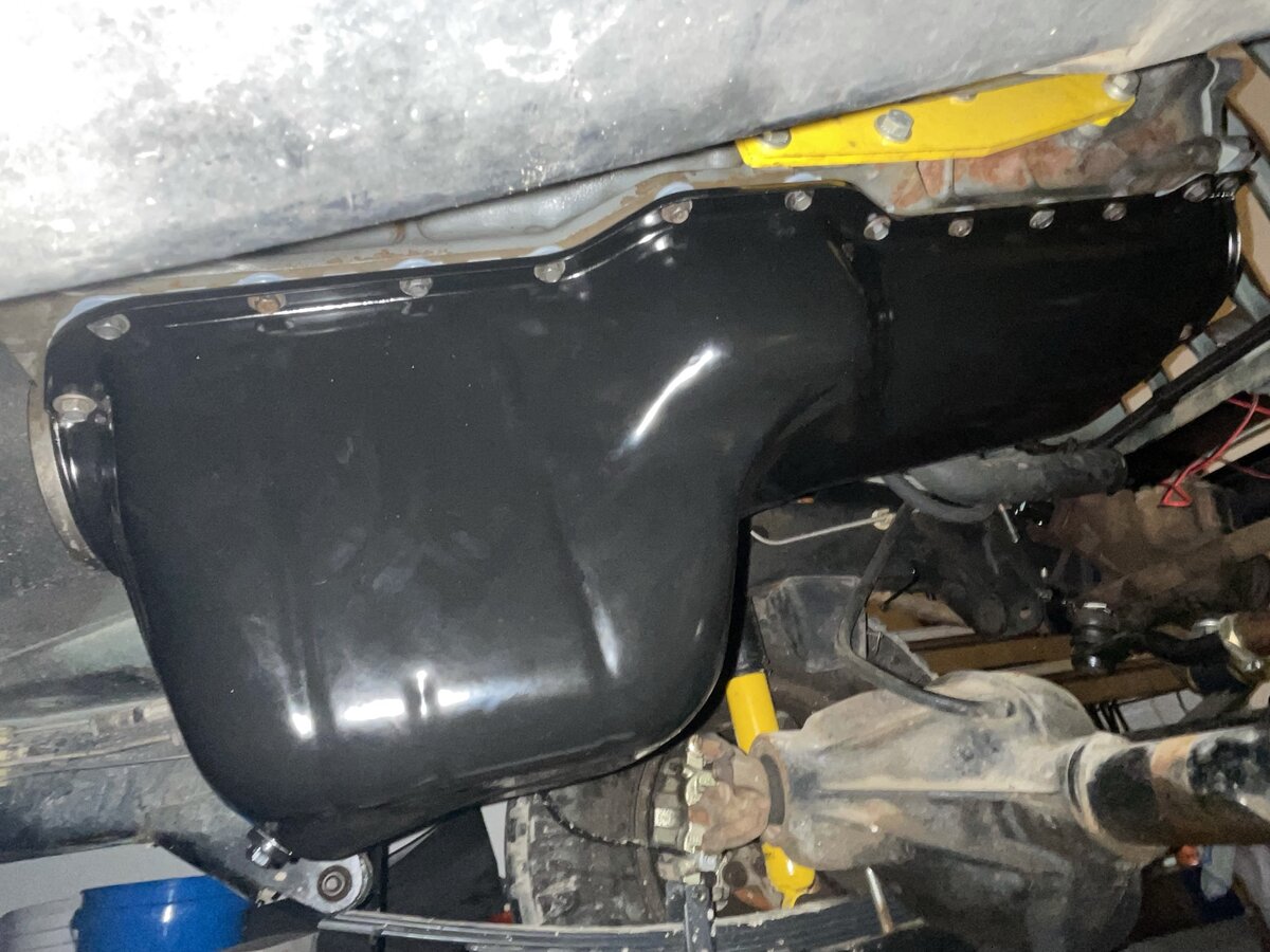 Oil pan in place! Looks a lot better than the nasty oil-covered gray one I had previously.