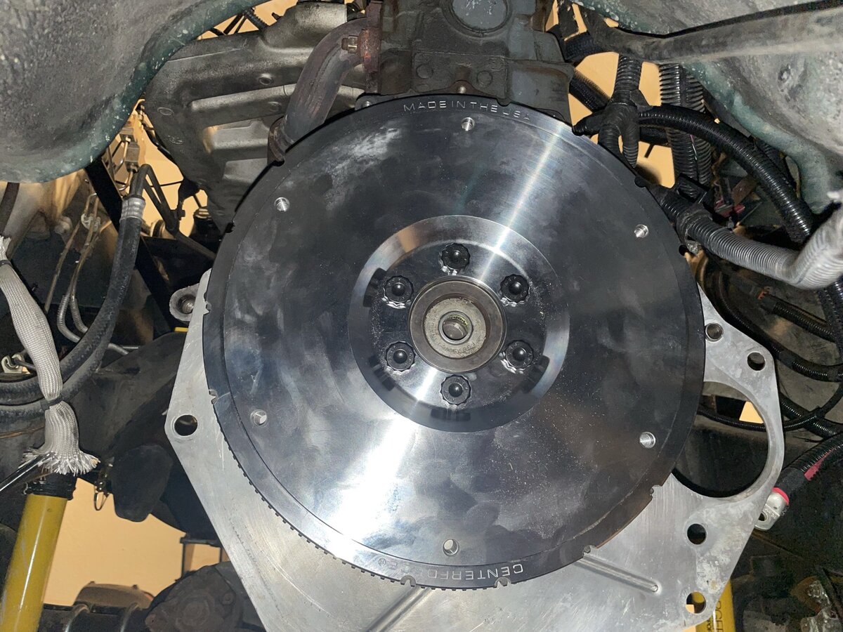 After finishing up the oil stuff, I hung the Centerforce flywheel late last night. For those unaware, a 40 lb flywheel is a BITCH to install by yourself! Heavy, wants to fall off the crank before you get the bolts in, and due to the bolt holes being unevenly spaced (on purpose), you have to figure out the proper flywheel to crank alignment of the bolt holes before you can actually bolt it down. This makes for up to 6 trial-and-error attempts to get it aligned properly. The worst part is that the flywheel cover plate has to go on the crank first, and it does not want to stay up on the engine while you install the flywheel. It's best to just have a helper, but I did make do without, albeit it took a bit longer and more tries.
