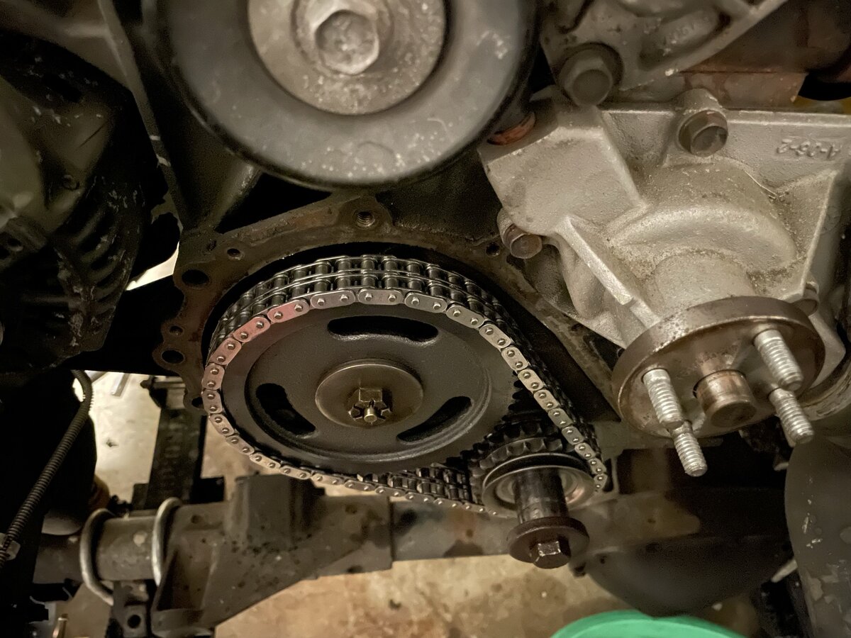 After a few days, I've made some more decent progress! I received all the parts except the harmonic balancer on Wednesday, so I've been doing bit by bit after work since. Wednesday I got the Cloyes double roller chain installed, as well as the new Mopar timing cover. It just so happens that the Mopar timing cover now includes a built in spacer for the AC idler pulley, so I don't even need the 1/4" spacer anymore! The pulley now lines up with the other pulleys on it's own perfectly. I don't have AC but eventually when I add it back, that will be handy.