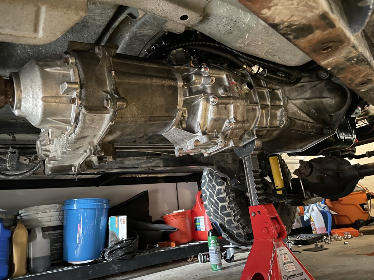 Indeed! I’ve never used the dowel pin method before actually. I’ve pulled my YJ’s transmission 3 times now. In the past we always used a regular floor jack and just balanced it. That was always a pain, although we honestly never struggled too badly with it that way. Still a pain and always a risk to drop and damage the transmission though. I bought a trans jack two years ago, knowing that I would need it for this YJ project eventually. Sadly the AX15 really doesn’t like to sit on it, so that’s why I struggled by myself to install the transmission this time. However, the flat plate is enough that it holds the transmission for me while I manipulate it on the dowels, so overall it all worked out and I can install a transmission by myself this way.Old tricks are the best tricks, eh?