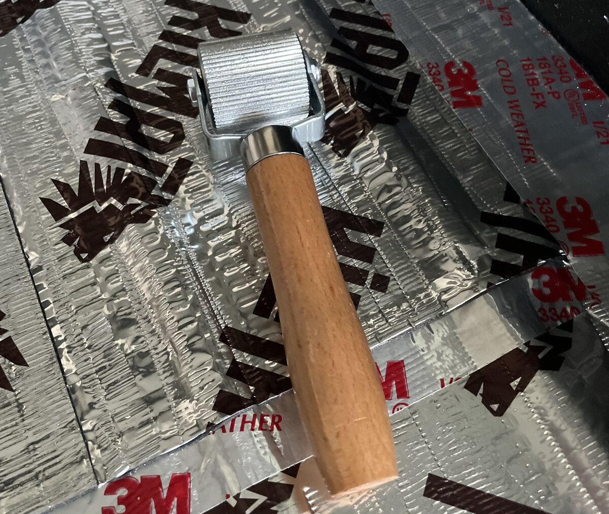 Using the rollers and my hands, it’s just a matter of cutting the pieces and sticking them down to the floor on one edge, then rolling them tight to the floor slowly until the whole piece is down. Overall it’s pretty easy, just takes time. I think the difference is going to be huge. You can tell how much less the tub is prone to loud tinny noise simply by tapping on the covered area. I’m excited to get this done.