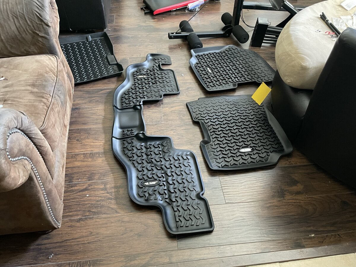 Finally got these beautiful floor mats in. They are surprisingly enough, Rugged Ridge/OMIX Ada brand. I would have never expected such a nice quality product from that company of typically garbage quality products. Well, I suppose they could still disappoint me if they don't fit the jeep well, but based off my memory of the Jeep floorboard they look perfect. They had 5 star reviews which is why i tried them, because otherwise I would have been too skeptical. They also were the most complete kit I found. Lots of kits skipped the back passengers feet mats, or the one under the backseat "cargo" mat. This was a complete kit so I decided to try. They are really heavy and appear to be EXCELLENT quality, so I'm glad to finally receive them.