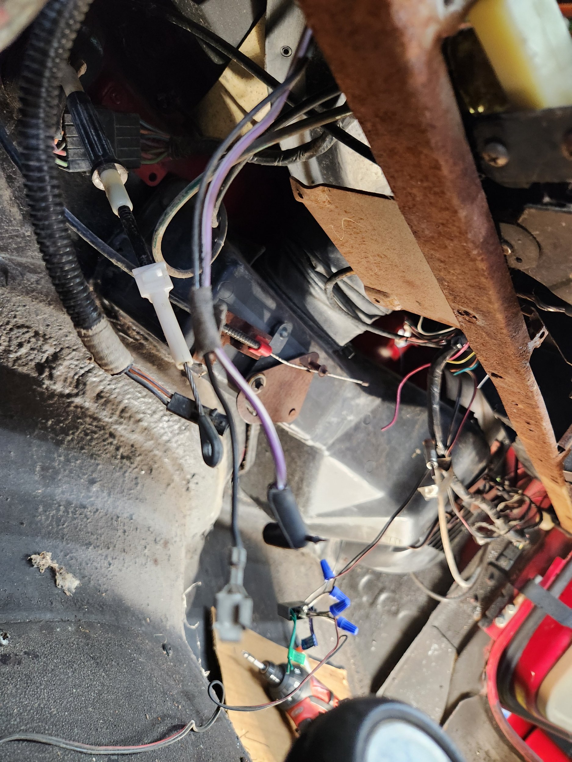 Fast forward to solving my issues thanks to some great earlier posts with photos on this forum. So - I got the 2 OMIX cables and installed them. The “red” cable they offer is for the rightmost of the two sliders viewed from the top of the control box when you slide it out. The “blue” cable is for the temperature slider and the eyelet simply goes over a hook in that control lever when viewed underneath the control box. The third cable is the one that they do not offer a replacement for, so reuse yours with care. I did the same thing that the OP did to secure it to my control box using a zip tie after drilling a small hole next to the mounting pedestal. You can use the plastic barrel assembly to adjust it in or out as you line up the eyelet to snap over the stud on its slider. I also used a pliers to run the eyelet in and out a few times before doing this just to be sure that I had full travel at the other end on my HVAC box. For the “red” cable - the replacement was inches shorter than what I removed from the Jeep. The original was secured to the firewall with a screw and grommet. You won’t be able to secure it back that way but no big deal. I left the other end of the “red” cable loose on the air box and only slide it onto its post after reinstalling my control box back in the dash. I also used a zip tie to keep that cable from rotating around in its post - had to make sure that it stays aligned after putting the control box back in place. By the way, my control box had much of the mounting post material broken away and gone, so I got a good used one on eBay before tackling this job.